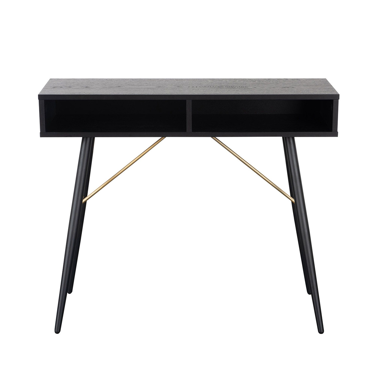 Black Oak melamine, powder-coated Black metal legs, copper metal accents.