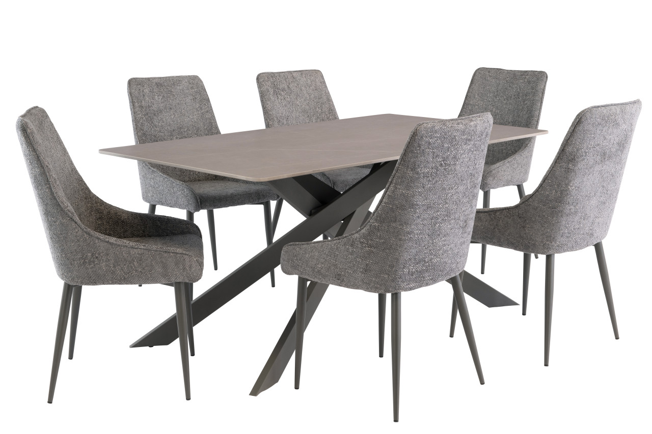 This expertly crafted dining table features a Matt Grey Sintered Stone top and a powder-coated x-shaped Black powder-coated base.This on-trend combination is sleek and sophisticated while offering a hint of urban cool.This Table comfortably seats up to 6 people.A contemporary cushioned Chair designed to bring boutique living to the masses.Lovingly tailored in a grey textured fabric with piping and finished with grey powder-coated legs.
