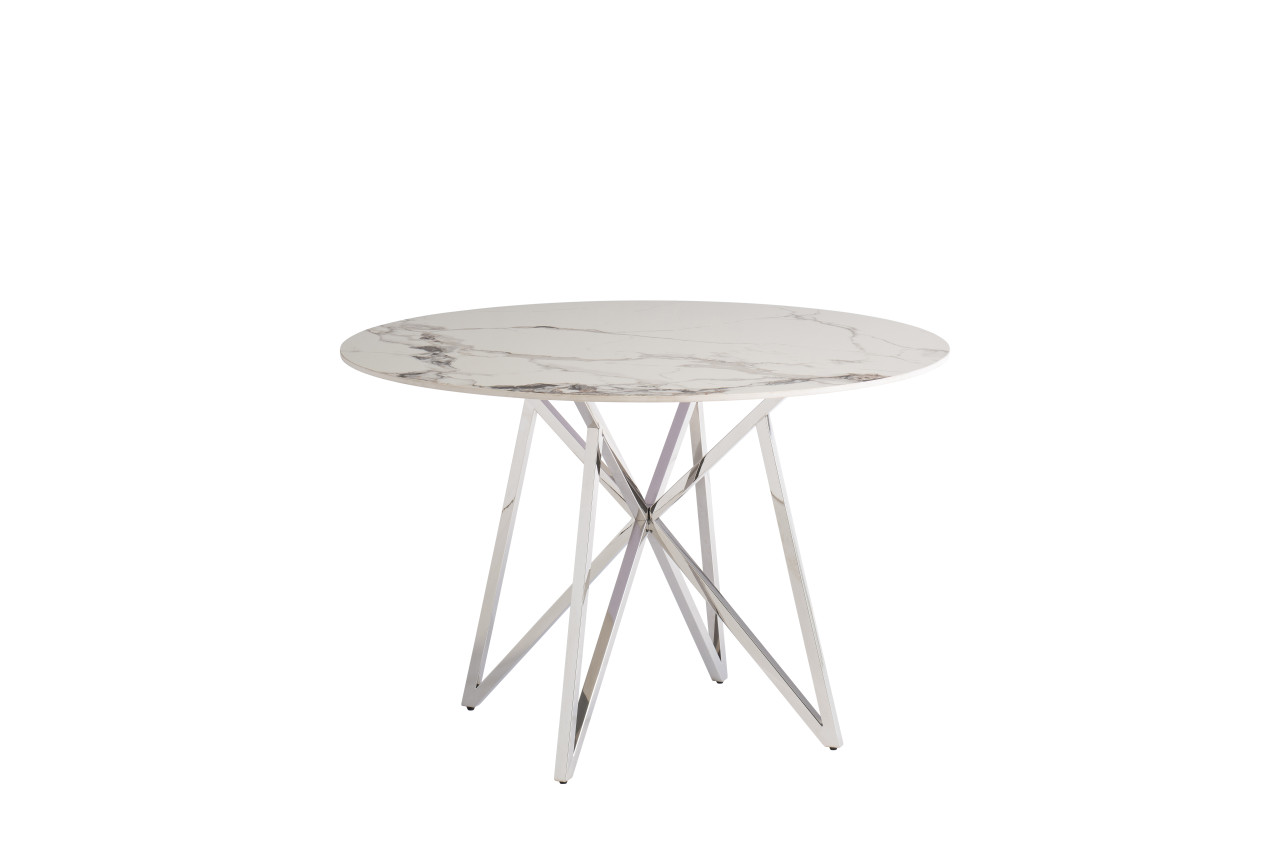 High-Gloss, crisp White Sintered Stone topped dining table will complement any kitchen or dining space.The beautiful marbling design is both distinctive and uniquely individual.Finished with a contemporary polished stainless steel design-feature base, this Table comfortably seats up to 4 people.