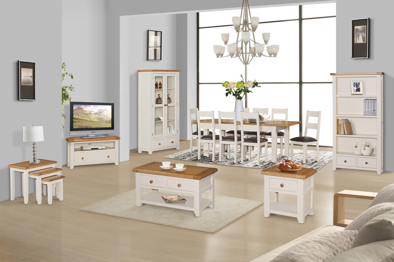 The Juliet dining and occasional range is finished in solid oak with semi-gloss lacquer seal. The rounded corners give a gentle feel to each solid piece. The champagne colour combined with the rounded solid oak knobs exude class.