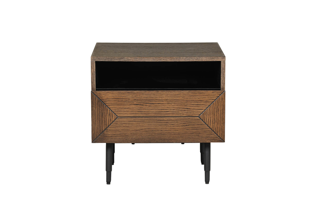 The Nate Bedside Table in Smoked Oak brings a contemporary touch to your bedroom. Constructed from engineered wood with a smoked oak finish, it features eye-catching geometric patterns that enhance its modern aesthetic. This bedside table is elevated on black powder-coated metal legs, adding a sleek and industrial contrast. It includes a single drawer for hidden storage and an open shelving unit above the drawer that has a painted finish.