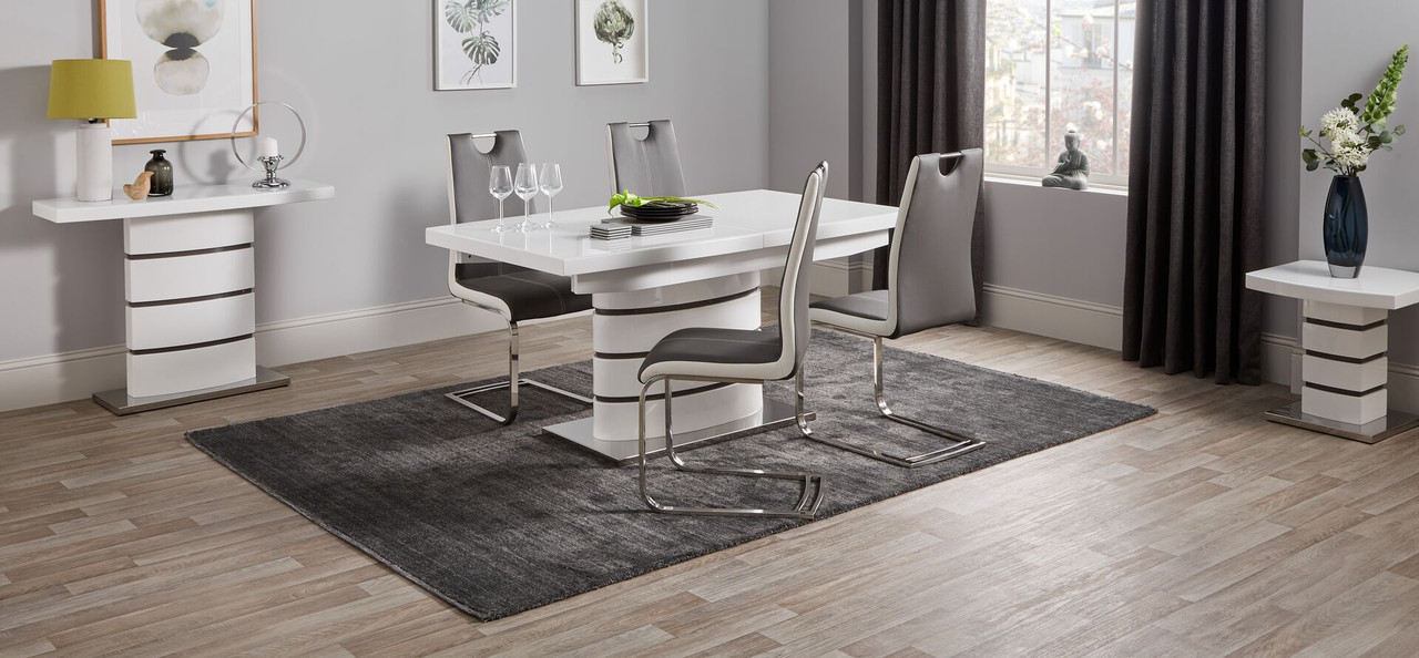 The Rimini Dining Set is finished in white gloss with a glass top. The dark grey butterfly extension is finished in high gloss and is easily extended for those special occasions.