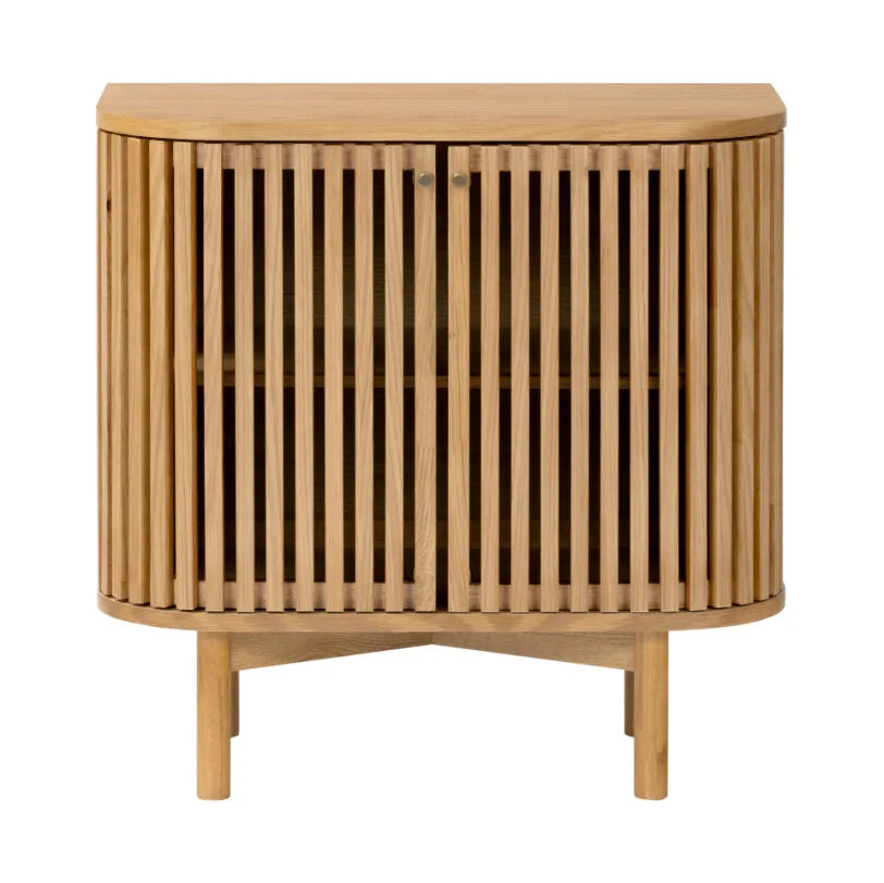 Straight slatted front contrasted with gentle curved edges.The slatted feature on the doors gives the design a lightness, a hint of texture and a distinguishing finish that will stand out in your living space.Beautifully simply gold handles bring the range to life while keeping the frame minimalist and streamlined.